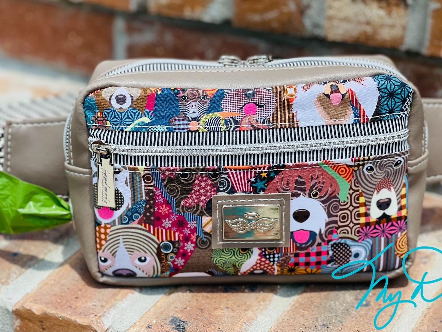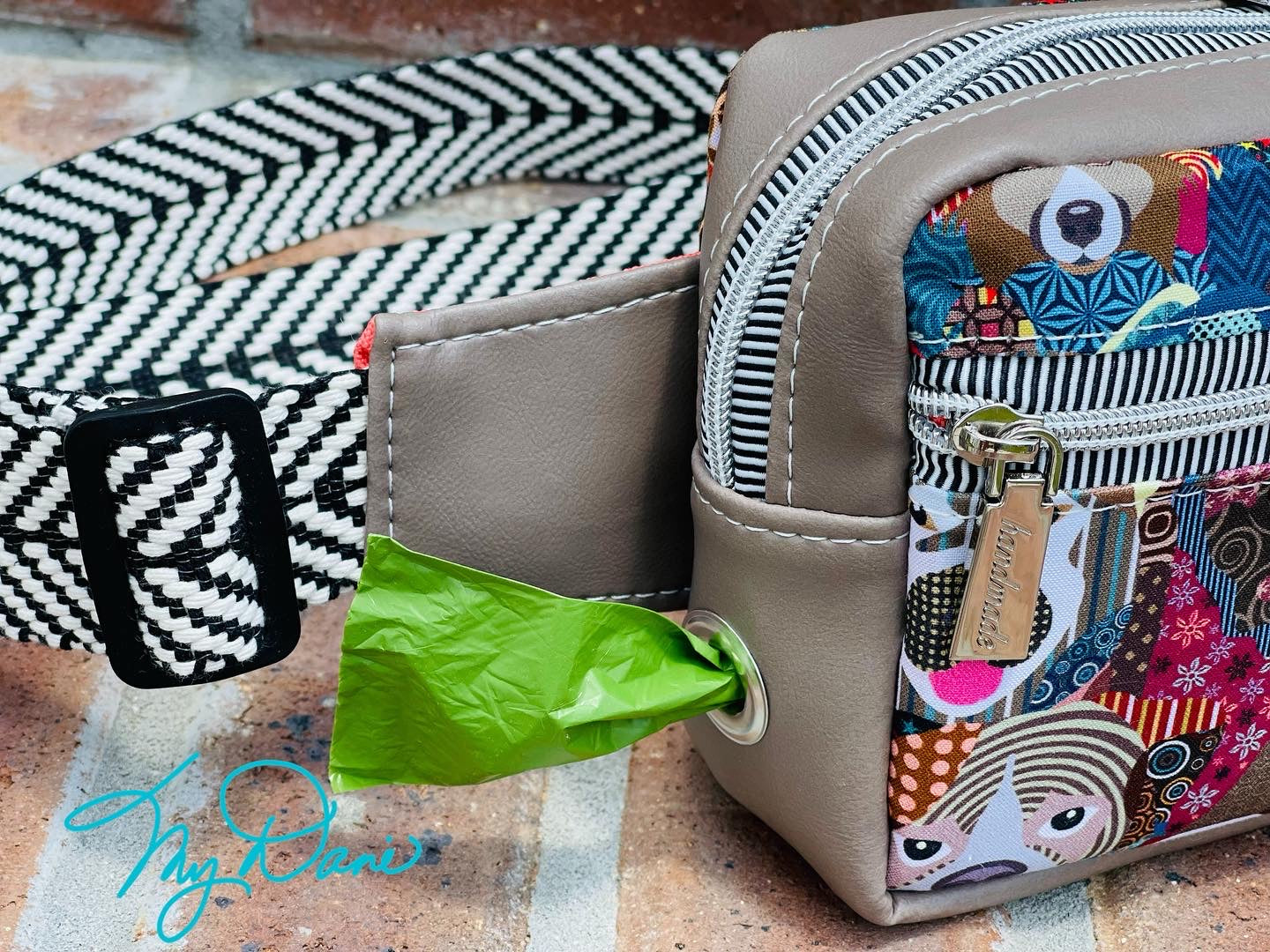 This bag is perfect for all the little things you may want to bring to the dog park or out for a stroll. The waterproof canvas lining has a built in credit card slot/slip pocket and a slip pocket. The outside zip pocket can hold a cell phone. Comes with a roll of bags.