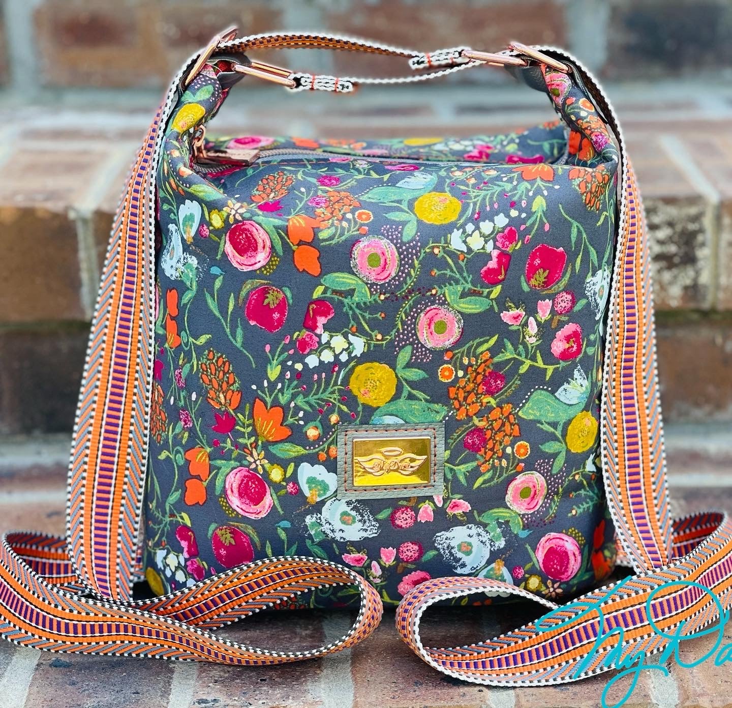 The Krystal Convertible Handbag is a large size bag that with one pull of the magic straps converts to a backpack. The lining is a waterproof canvas with a zippered pocket, a slip pocket and also has a built in credit card slot/slip pocket. The exterior of the bag has a zippered pocket and a slip pocket. Everything you need to stay organized and hands free.