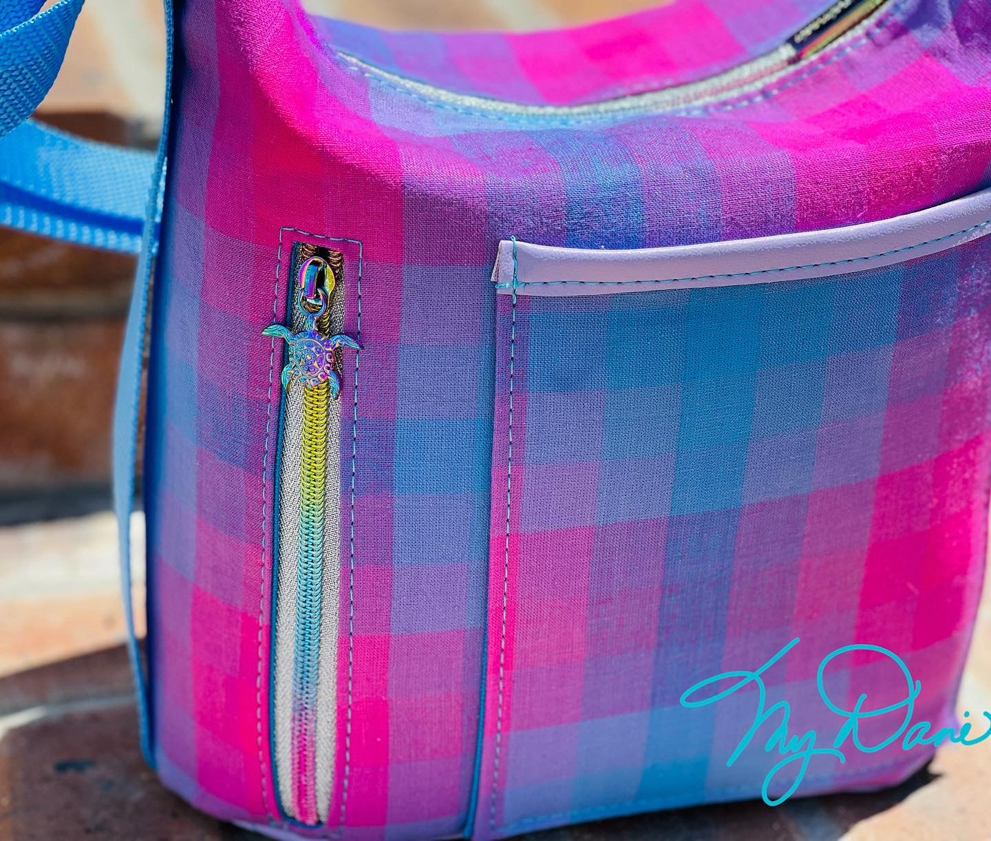 The Krystal Convertible Handbag  is a large size bag that with one pull of the magic straps converts to a backpack. The lining is a waterproof canvas with a zippered pocket, a slip pocket and also has a built in credit card slot/slip pocket. The exterior of the bag has a zippered pocket and a slip pocket. Everything you need to stay organized and hands free.