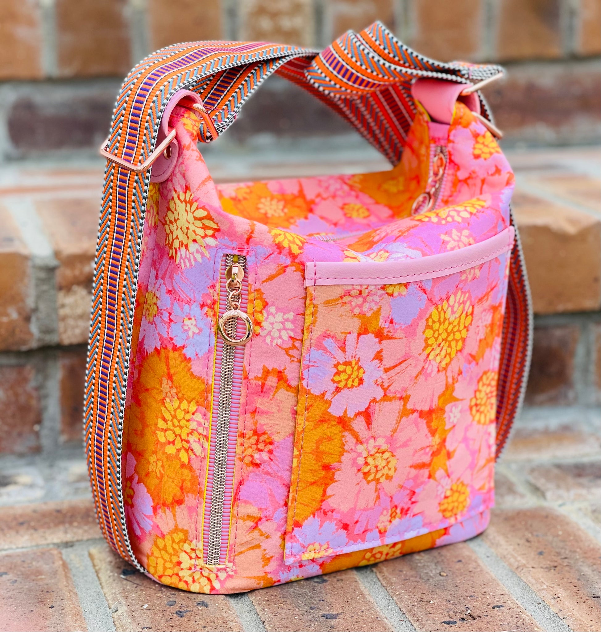 The Krystal Convertible Handbag Mini is a medium size bag that with one pull of the magic straps converts to a backpack. The lining is a waterproof canvas with a zippered pocket, a slip pocket and also has a built in credit card slot/slip pocket. The exterior of the bag has a zippered pocket and a slip pocket. Everything you need to stay organized and hands free.
