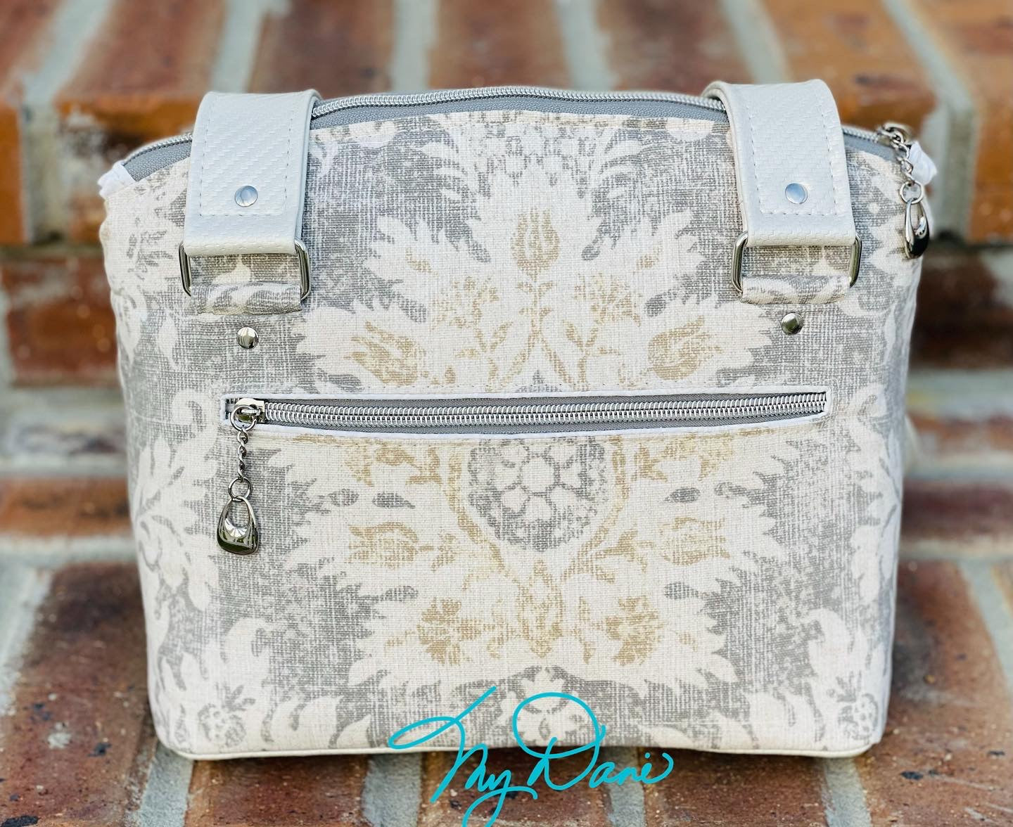 This gorgeous classic handbag has a water proof canvas lining that has a zippered pocket, a slip pocket and a built in credit card slot/slip pocket. It also features a large outside zippered pocket for your cell phone.