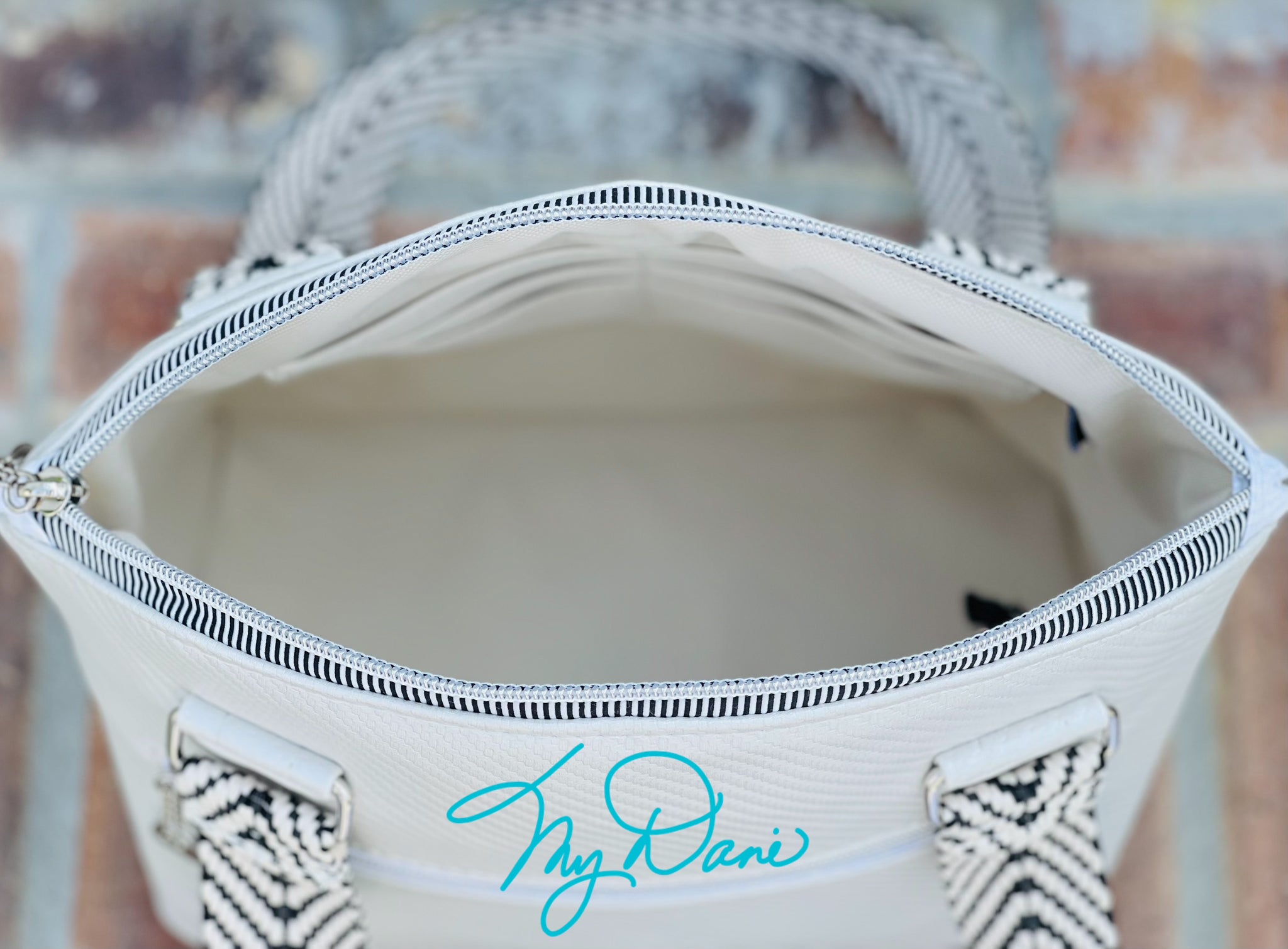 The Lola is a classic Handbag style that is a medium size bag. The waterproof canvas lining has a zippered pocket, a slip pocket and a built in credit card slot/slip pocket. Everything you need to stay organized.